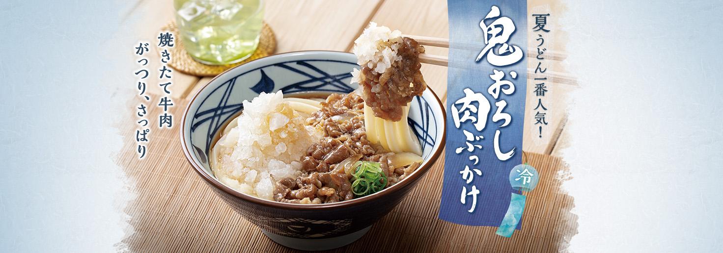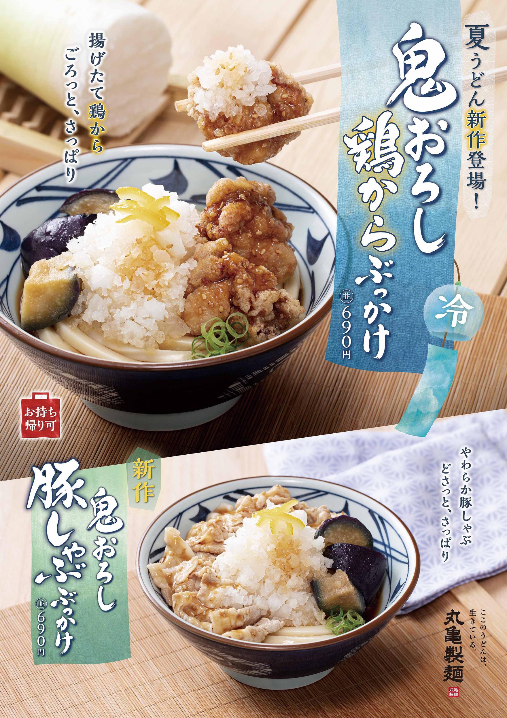 丸亀製麺の2022年夏期フェア3種の商品「鬼おろし肉ぶっかけ」「鬼おろし鶏からぶっかけ」「鬼おろし豚しゃぶぶっかけ」のプロモーション。