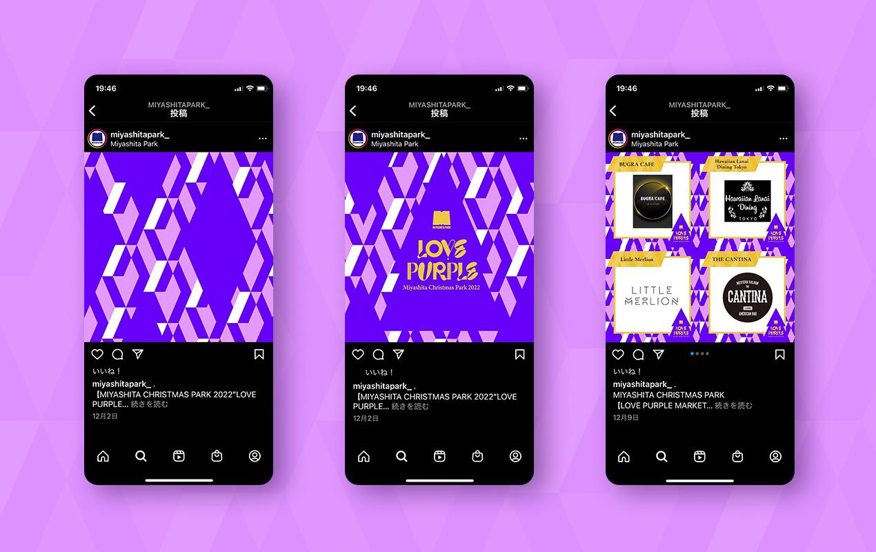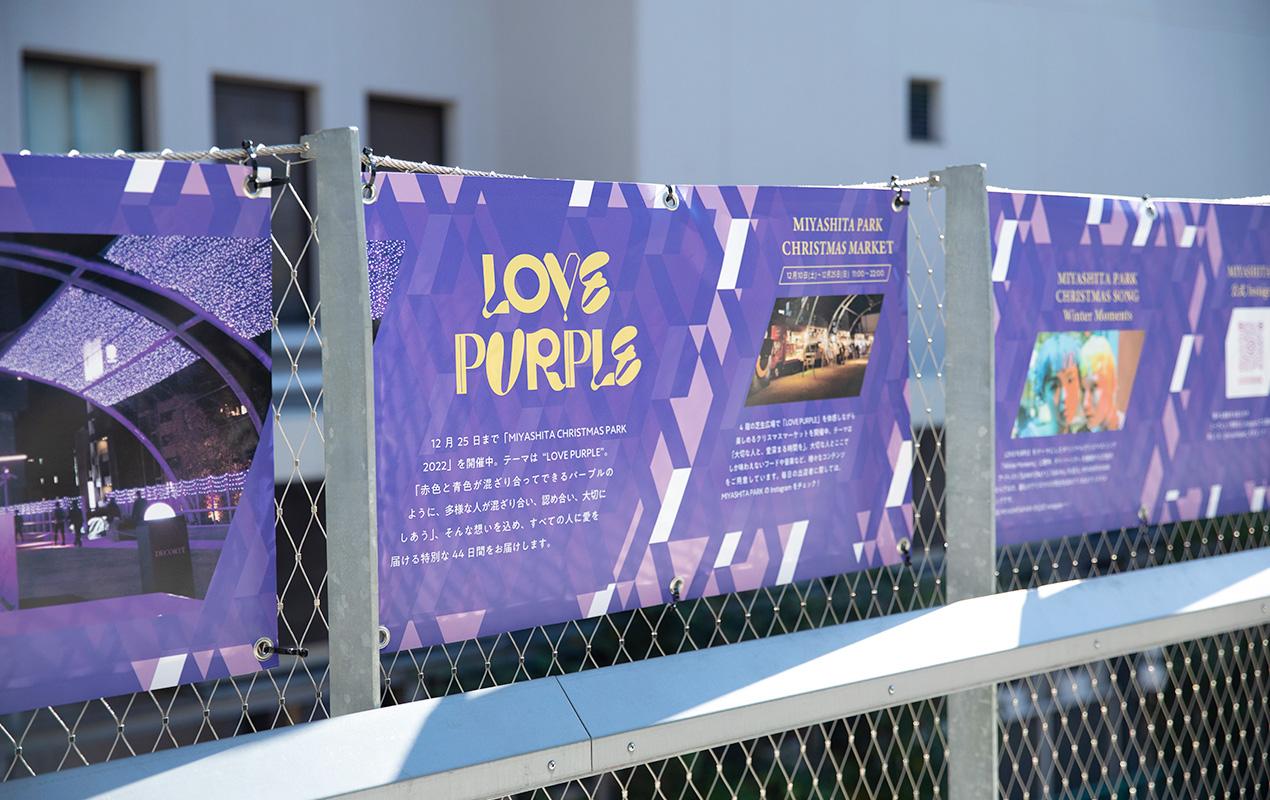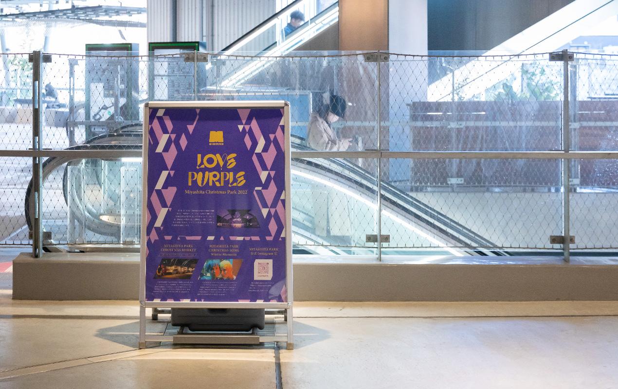 MIYASHITA PARKにて「#LOVE PURPLE」をテーマにしたクリスマスイベント「MIYASHITA CHRISTMAS PARK 2022」を開催。ハイライツでは、タイトルロゴ、キービジュアルの制作と、それをベースにした各種グラフィックやグッズの制作を行いました。また、このイベントのためにつくられたオリジナルソングのミュージックビデオにもキービジュアルが使用されています。