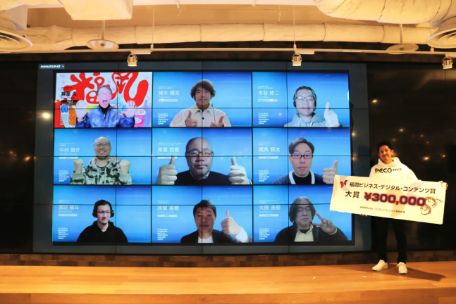 2022年2月8(火)に行われた福岡ビジネス・デジタル・コンテンツ賞2022の公開審査会では、事前に行われた厳然なる審査や関連コンテストで選出された13組が登壇。結果、PECOFREEが大賞に選ばれました。