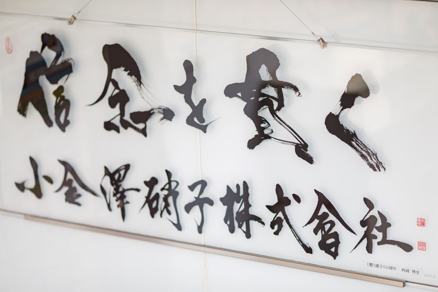 硝子の会社である小金澤のエントランスには「信念を貫く」と書かれた看板があります。