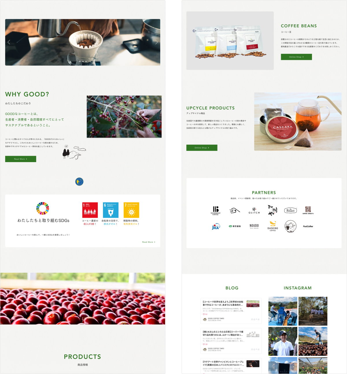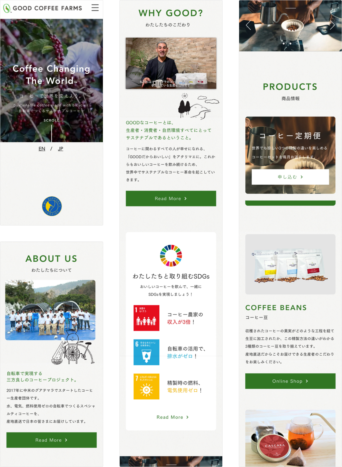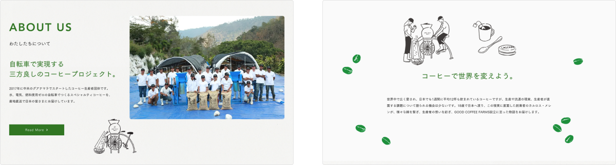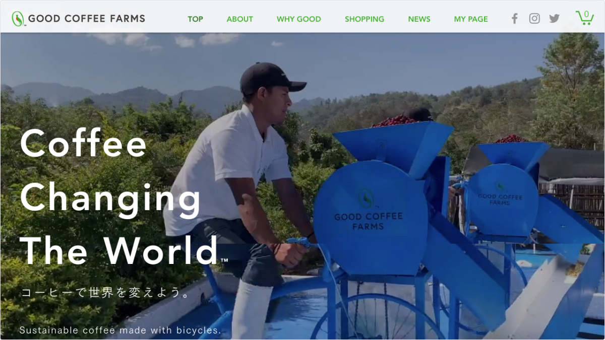 世界初の「自転車で作るコーヒー」を開発した、生産者・消費者・自然の全てがサステナブルであることを目指している「GOOD COFFEE FARMS」のデザインパートナー事業として並走しました。ロゴのリファイン作業から始まり、ノーコードサービスWixを使ってコーポレートサイトを立ち上げ、コーヒーの定期便に同封されるリーフレットの制作なども行いました。