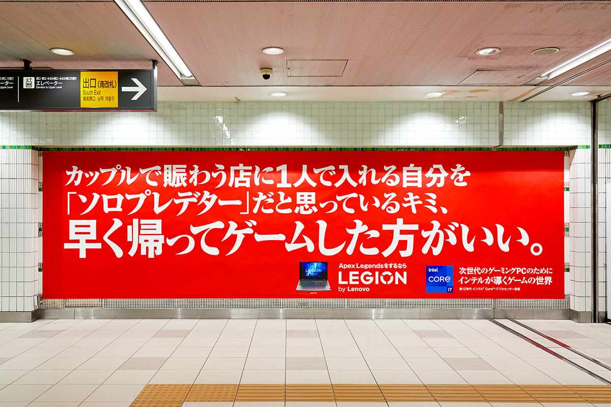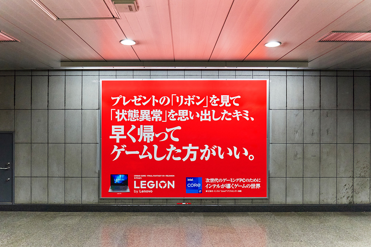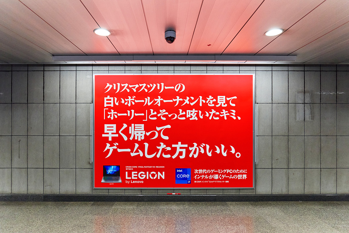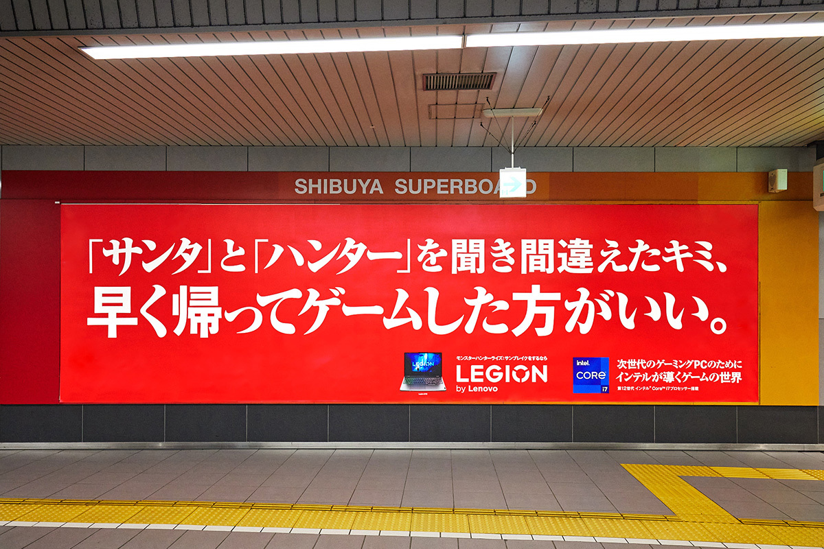 LenovoのゲーミングPC「LEGION」の広告として、「トナカイを見ると狩りたくなる」「煙突の影に隠れて敵が狙える」など、ゲーマーにしか見えないクリスマス風景をコピーで表現し、そんな風景が見えてしまったゲーマーたちに「早く帰ってゲームした方がいい」と諭す屋外広告を企画・制作しました。