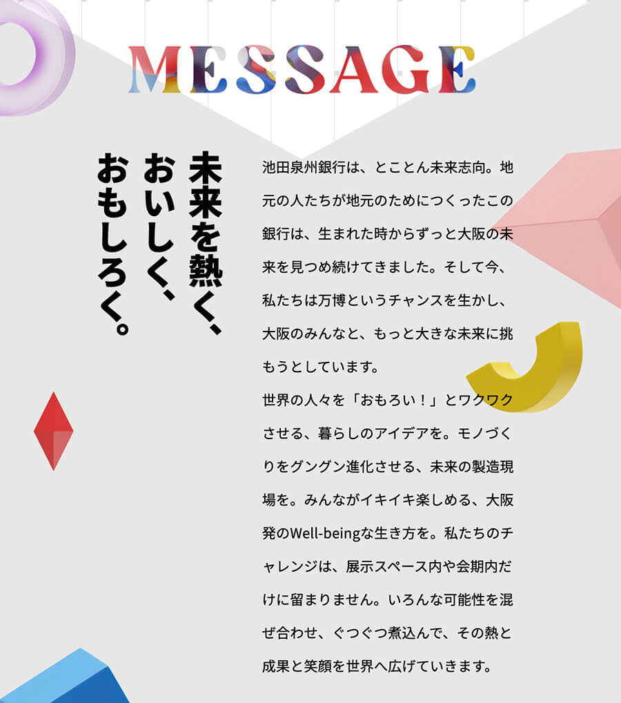 池田泉州銀行は、この大阪ヘルスケアパビリオンで実施する「リボーンチャレンジ」の企画運営を通じて地元企業の事業成長を支援します。