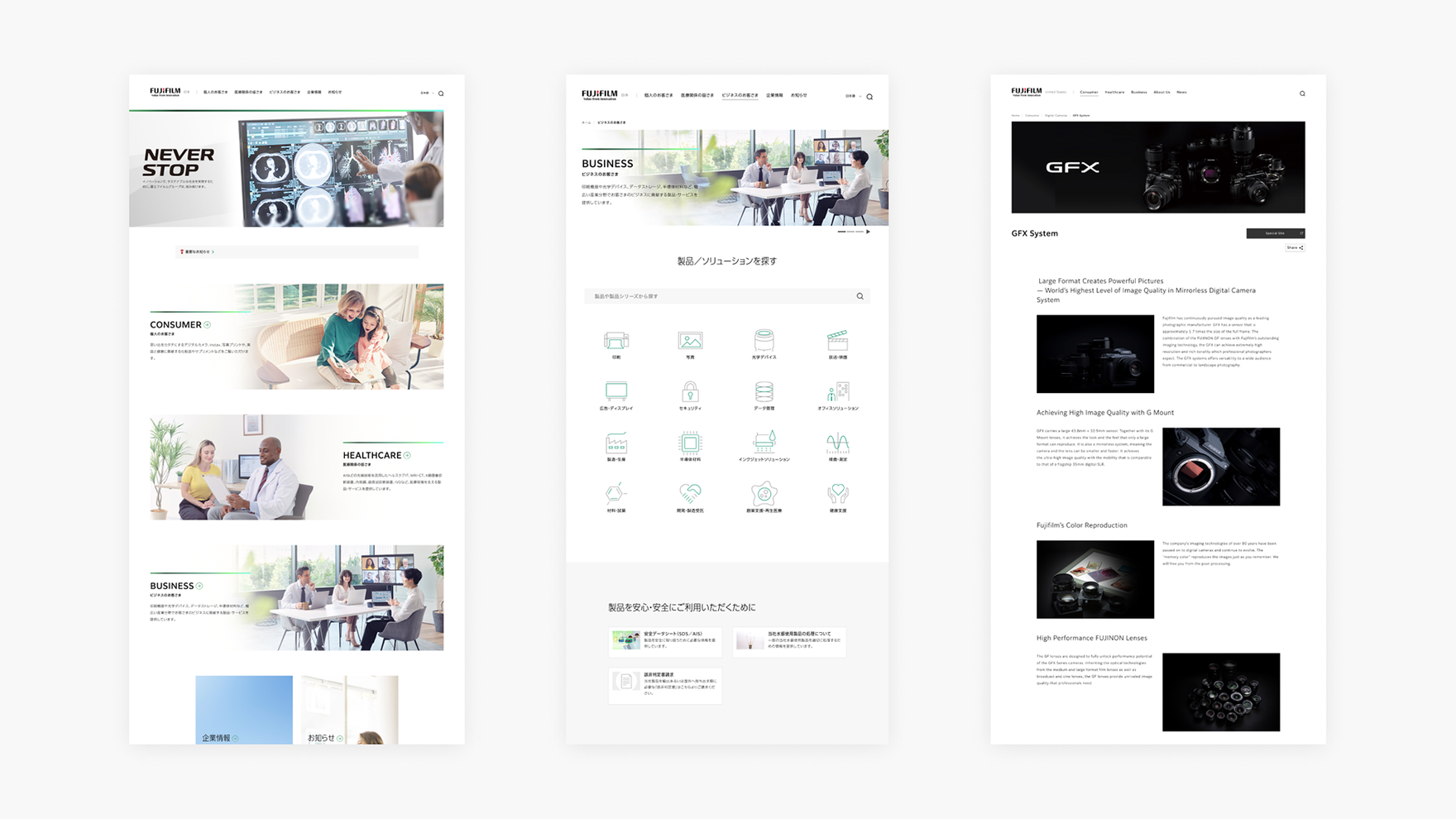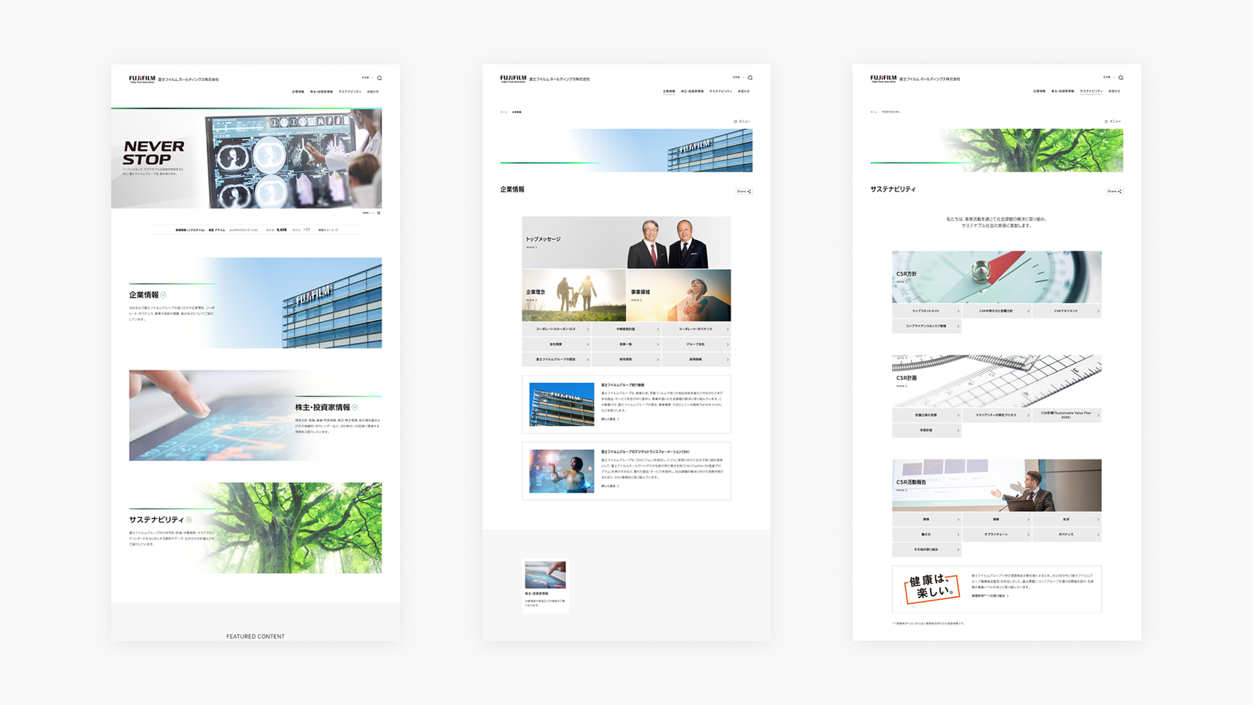 富士フイルム株式会社様および関係会社様の製品情報・企業情報を社外向けに広く公開する公式サイト。多様な事業を展開する富士フイルム株式会社様の公式サイトは、ワールドワイドで100を超える大規模サイトです。ワンパクは情報設計、UI/UXデザイン、フロント設計~開発を担当いたしました。