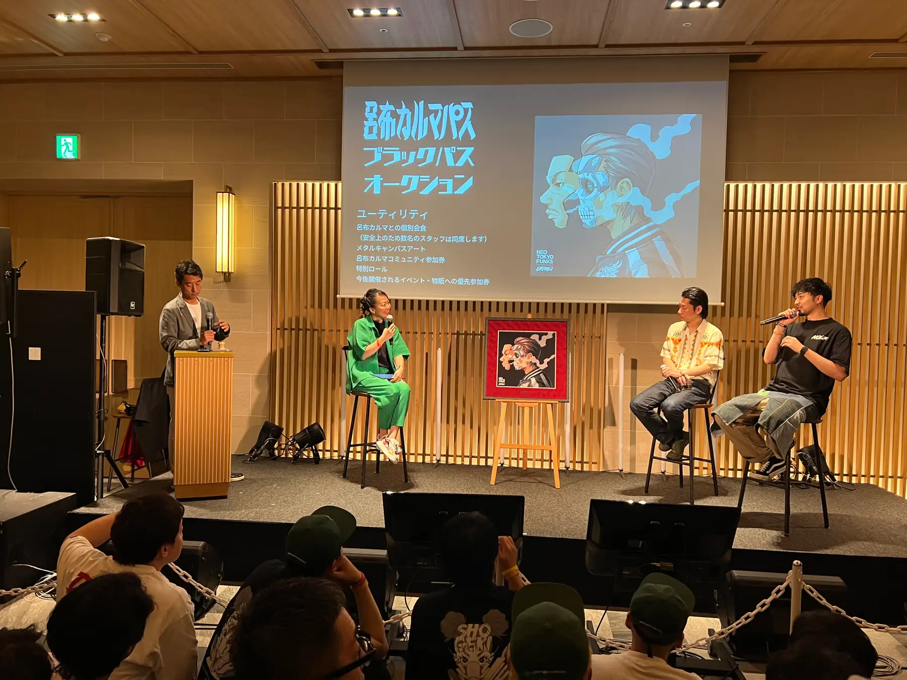7月28日、渋谷TRUNK(HOTEL)で開催されたNFT ART TOKYO4(以下NAT4)にて、著名なラッパー呂布カルマ氏のパフォーマンスおよび、特設ステージにてクリエイターNIKO氏とのトークショーと、世界に一枚だけのNFT「ブラックパス」のオークションが行われました。