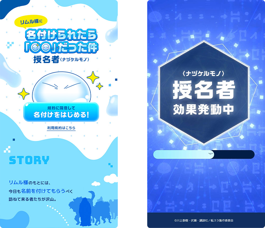 転スラらしい「スライム」の要素と、近未来的な「AIシステム」感を体験フローに合わせて取り入れることで、コンテンツへの没入感を高めています。