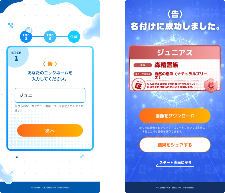 「リムル様に名付けられたら「〇〇」だった件 授名者(ナヅケルモノ)」は、『転スラ』の主人公リムルが行う「名付け」をイメージしたAI生成コンテンツです。プレイヤーが入力したニックネームを弊社でチューニングしたAIで解析し、関連要素を含む「名前」や「種族・スキル」を出力するように開発しました。