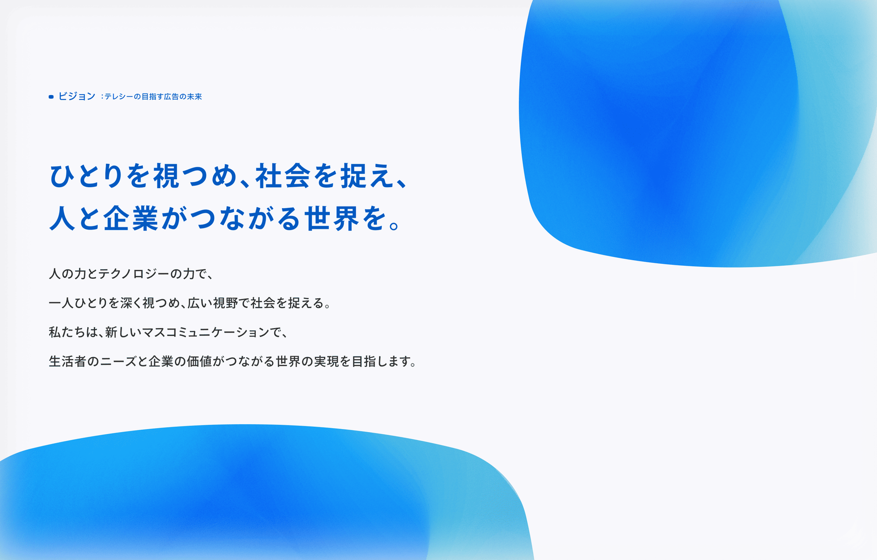 この言葉には、変化を恐れず時代や世の中に求められることに対して常に挑戦する姿勢と、これまで効果や価値が不明瞭になりがちなマスコミュニケーションにデータやテクノロジーで必然を生み出すことに挑む姿勢が込められています。