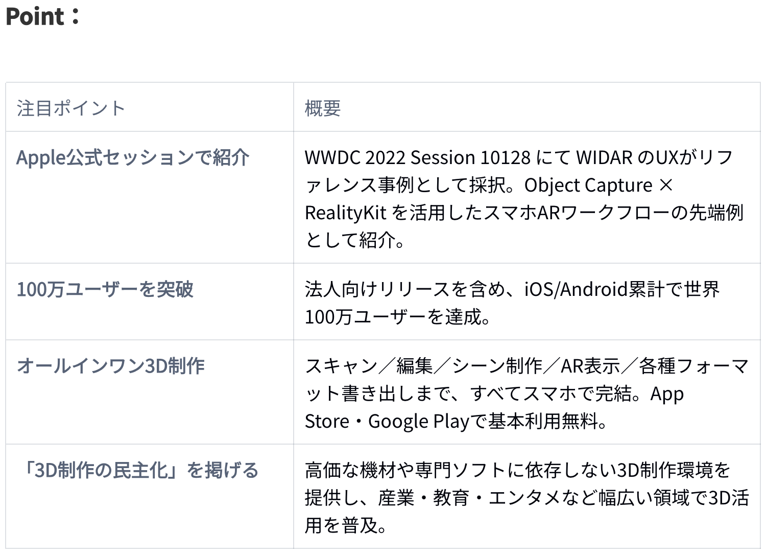 株式会社WOGOが開発・運営する3Dスキャン&編集アプリ 「WIDAR」 が、Apple社の年次開発者カンファレンス WWDC 2022 の公式セッション「Bring your world into augmented reality(Session 10128)」内で取り上げられました。ビデオ冒頭 2 分14 秒頃に WIDAR のデモシーンが登場し、Object Capture を生かした“スマホ完結”の3D制作ワークフローが高く評価されています。WIDAR は2022年の正式リリース以降、世界で100万ユーザーを突破し(2024年4月時点)、 iOS/Android 双方で手軽かつ高精度な3Dコンテンツ制作体験を提供しています。