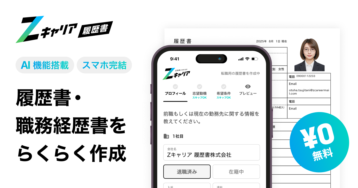 「Zキャリア 履歴書」では、生年月日を入力するだけで学歴情報を自動で補完し、4つの設問に答えるだけでAIが志望動機を作成します。「やりたいことが決まっていない」「どう書けばよいかわからない」など、自分の考えをうまく言語化することが苦手な方でもAIが就職活動をサポートします。作成した履歴書はクラウド上に保存され、専用アプリ不要でいつでもコンビニのマルチコピー機から簡単に印刷が可能です。