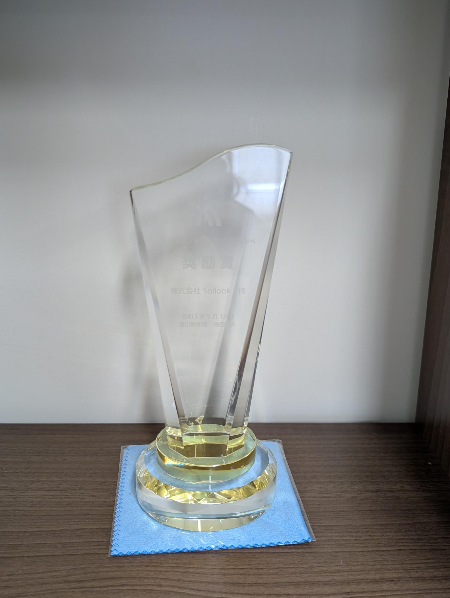 2023年9月に弊社のコアとなるガス可視化カメラ事業で、香川県のビジネスチャレンジコンペの奨励賞を受賞しました。トロフィーがガラスでできていて、写真が微妙な感じになっていますが、ご理解いただけますと幸いです。ここから加速するSoilook!