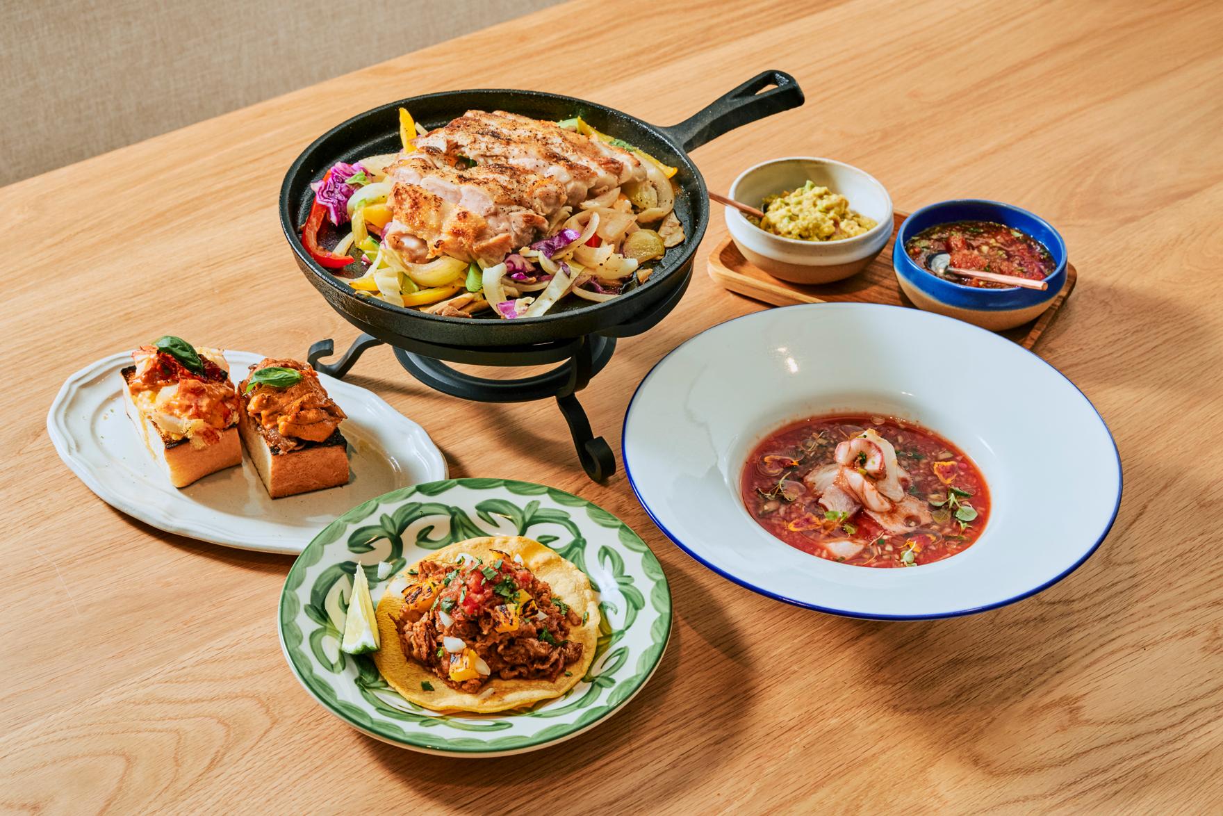 理の自由な発想を軸に、香ばしく焼き上げたトスターダス、新鮮なセビーチェ、季節のタコス、そしてカカオ