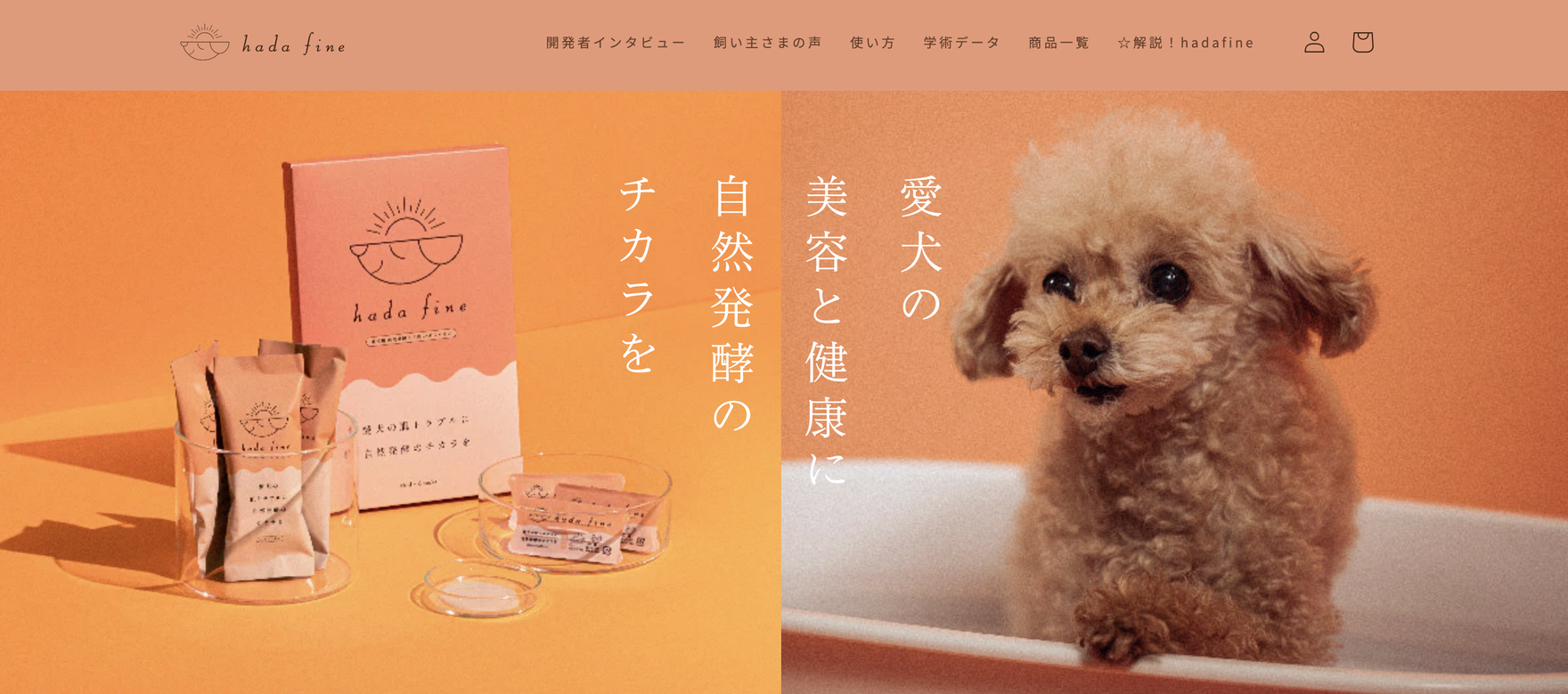 シーエイジング社の商品「hada fine」の紹介LPを作成しました。「hada fine」は、ワンちゃん専用の入浴剤。「愛犬の肌トラブルに悩んでいる ※皮膚の痒み、赤み、乾燥など」「愛犬の臭いに悩んでいる」「愛犬の毛艶をケアしたい」といった、愛犬家のニーズに応えた商品。特にお肌の弱いワンちゃんのことを考えて作られた商品です。