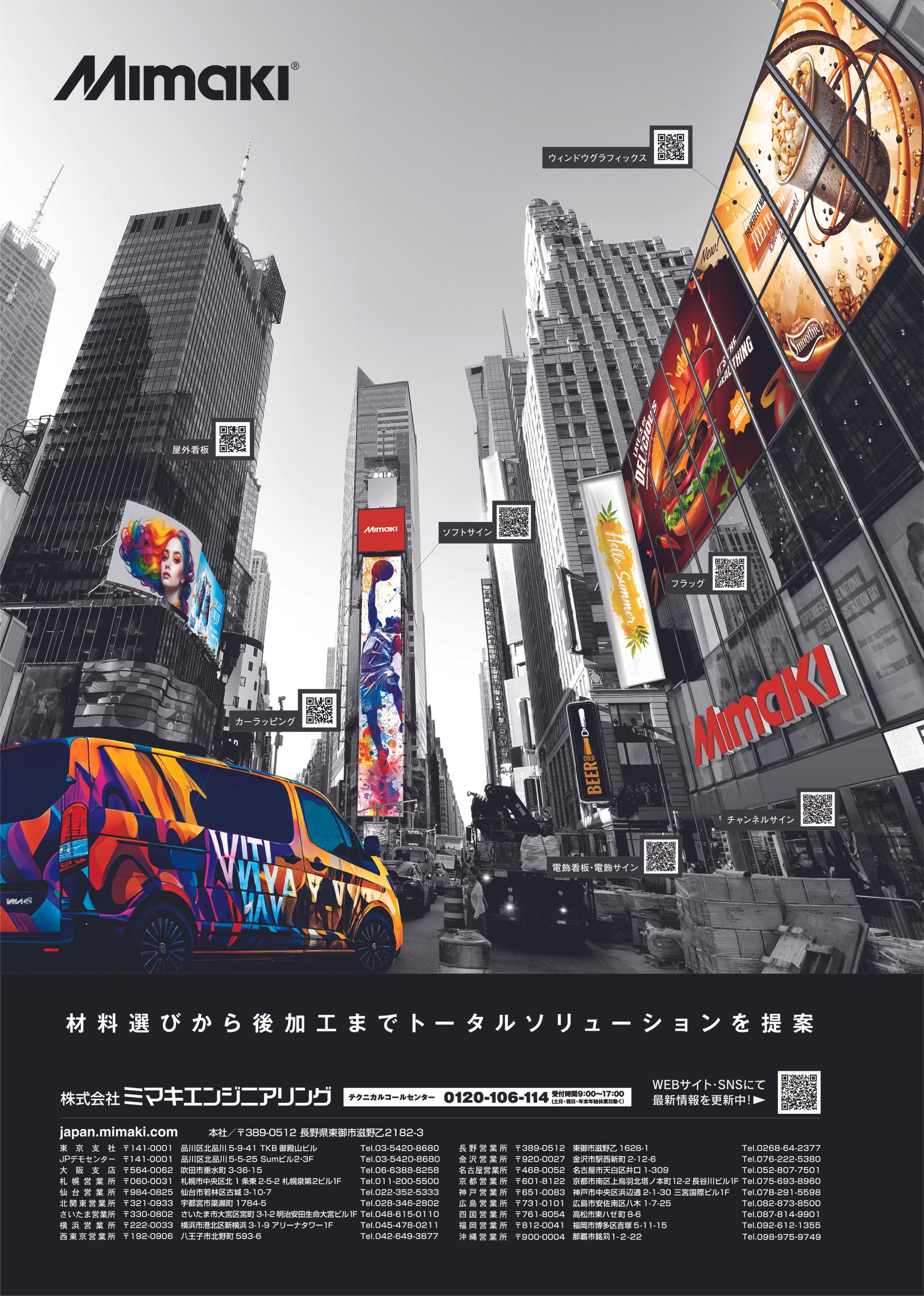 屋外広告の業界誌の裏表紙に出稿する広告の制作を依頼いただきました。 「シンプル・文字少なめで、機種には言及せず、街中の風景に、業務用プリンターの成果物である様々なグラフィックが配置され、すべてミマキのプリンターで実現できる、ということを広告で表現したい。」というご要望と、打合せの際にホワイトボードに手描きで記載いただいたイメージをもとにビジュアルを制作しました。
