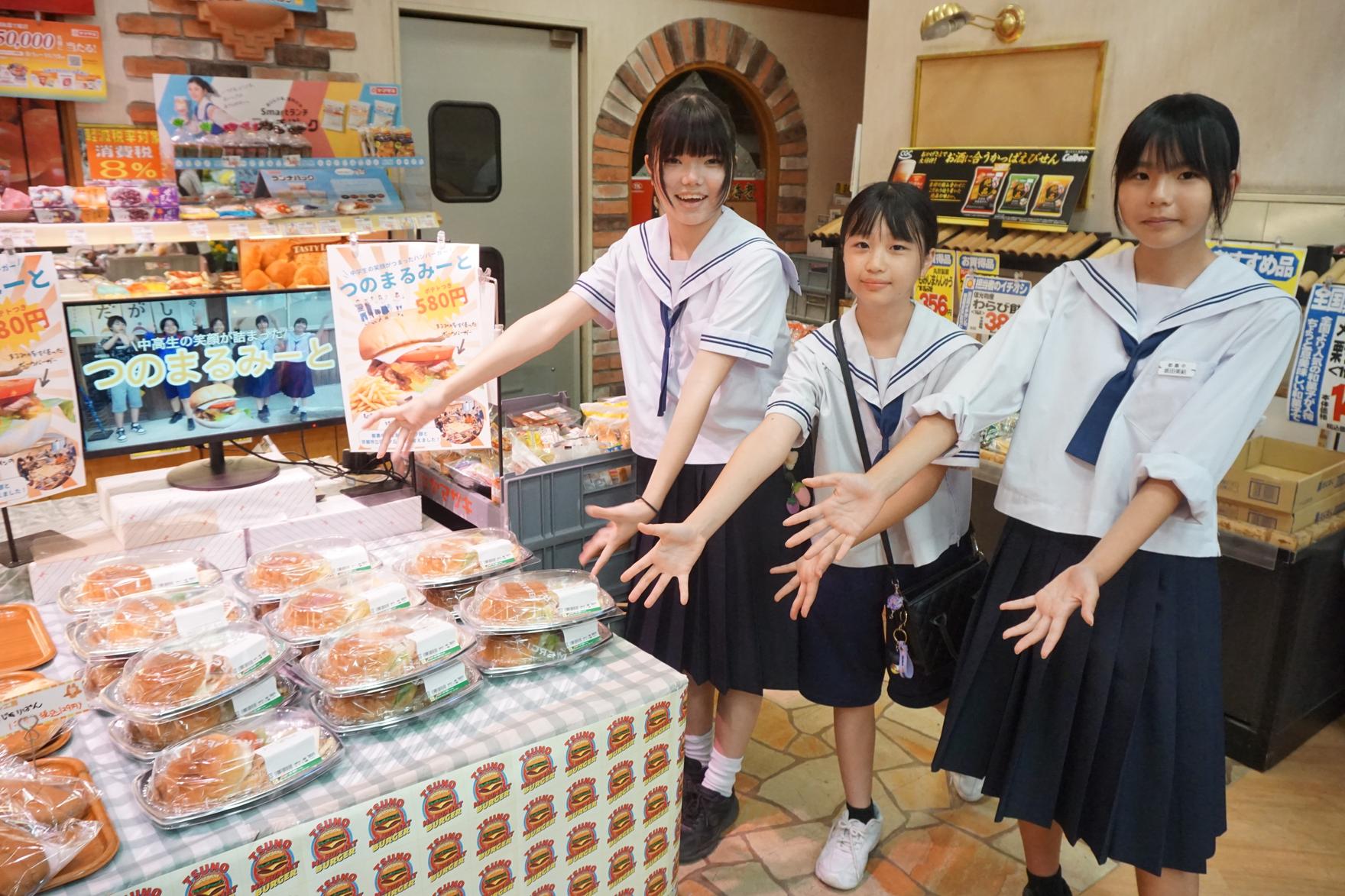 地元スーパー「パントリーけいすけ」×まちづくり部×京都市立日吉ケ丘高校で、オリジナルハンバーガー「つのまるみーと」を開発。2日間で120個完売という実績を達成。中学生が商品企画・ネーミング・PRまで一緒につくりました。