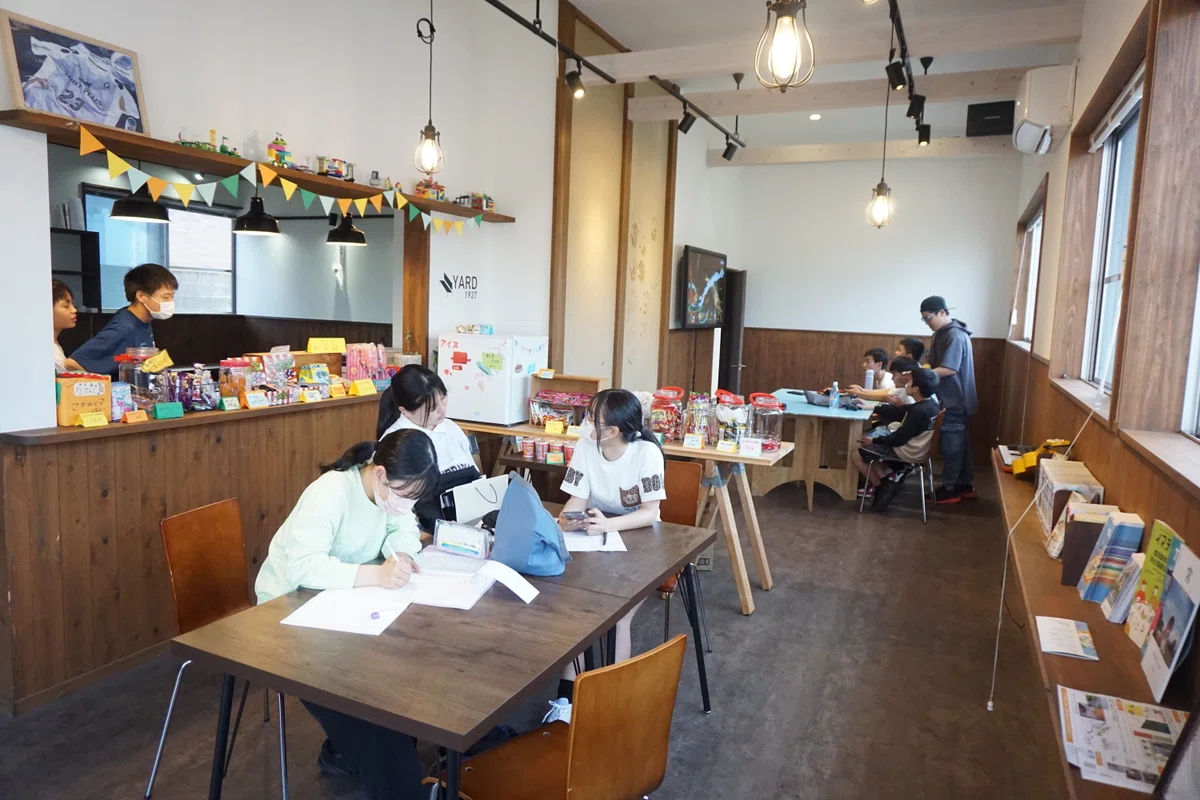 週2回(水・金)、中学生が仕入れから販売・接客まで経営。利益計算、在庫管理、店内レイアウト、のれんデザインまですべて中学生と共創。小中学生や大人も訪れる「居場所」になっています。
