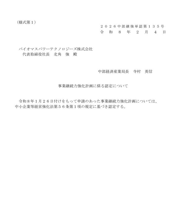 令和8年1月26日付けにてバイオマスパワーテクノロジーズ株式会社が申請した事業継続力強化計画が、中小企業等経営強化法第56条第1項の規定に基づき、中部経済産業局長より同年2月4日付けにて認定されました