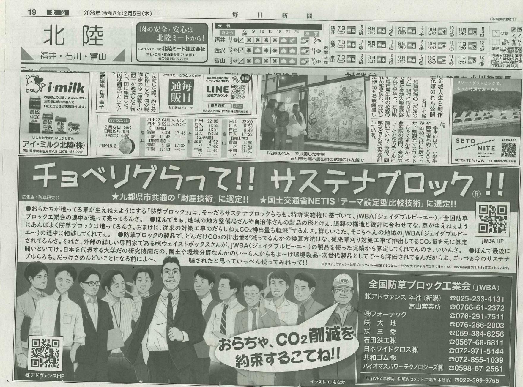 バイオマスパワーテクノロジーズ株式会社が所属する全国防草ブロック工業会(jWBA)の広告が、令和8年2月5日付け毎日新聞北陸版(福井・石川・富山)にて掲載されました