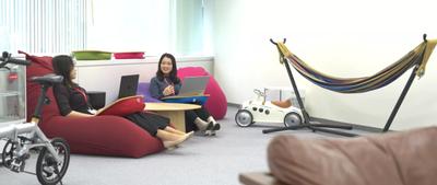 【オフィスコンセプト】オフィスは、当社のミッションである「前例のない熱狂を、しかける。」を表現するため、「WOW!」をコンセプトに設定しております。前例のない取り組みを行うには、「冷静と情熱」の両方が必要です。フロア内は、この2つを象徴する青と赤のRGBライティングで表しています。印象的なエントランスは、壁に開けられたポリゴン状の穴が、多くの障害を乗り越えて拡大してきた当社の突破力を映し出しました。