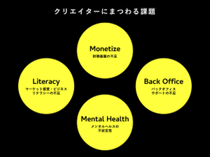 クリエイターが抱えている課題として大きく、「財務基盤の不足」「マーケット感覚・ビジネスリテラシー の不足」「バックオフィスサポートの不足」「メンタルヘルスの不安定性」の4つが存在します。