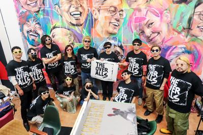 歯の詰め物セメントを作る株式会社GCの工場に巨大壁画。創業者がセメント瓶を双眼鏡にして未来を見通す姿を描いた。完成記念の写真はみんなで商品の瓶を持って撮影。この笑顔が一番の僕たちの作品かもしれません。大規模な壁画プロジェクトが年々増えています。プロジェクトの始まりから長いものですと1年かけて完成させるイメージのものも。さらに大規模な案件で今いただいているオファーも3年後に制作というプロジェクトもいくつかあります。