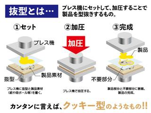 あらゆる産業に使われる抜型の製造を行っています。お菓子の箱や化粧品の箱、イチゴのパック、自動車のシートなど、様々なものが抜型により生産されています。