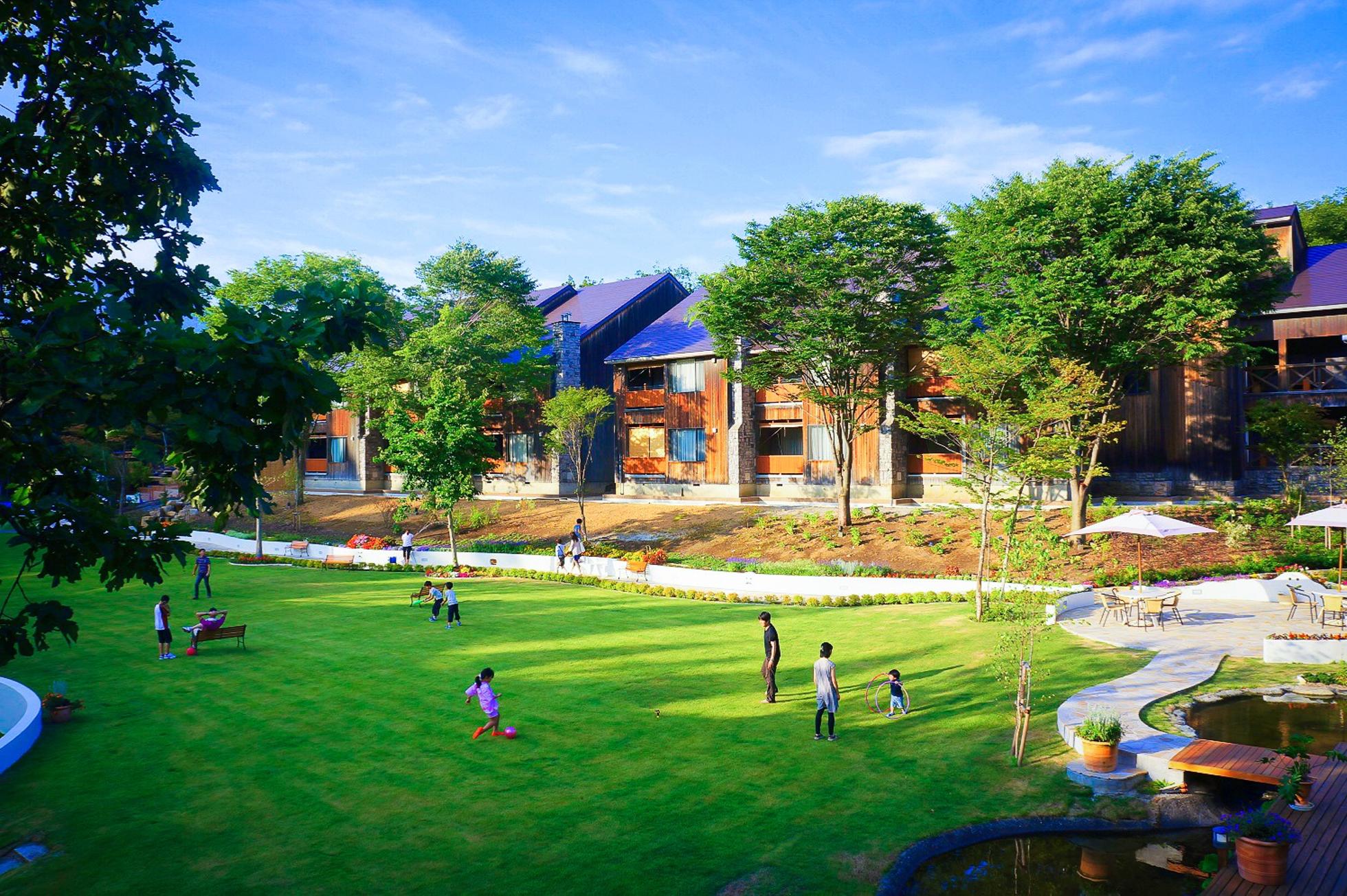 北アルプス白馬山麓、3万坪の敷地に建つ高原リゾート。客室数は全74室。