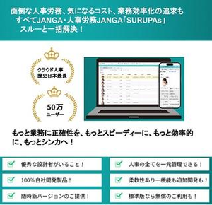 ◆積極的な議論を、最優の未来へ 2002年起業、業務効率化のため、JANGAコネクター研究成功、日本初POSインターネット化実現、その後「人事・労務」の業務を効率化のため、JANGA「SURUPAs」のサービスの誕生、全国50万超の利用者の効率化を支援させています。お客様の付加価値を最大化のため、社員同士が常に積極的に議論したり、最善案を上げたりして、お客様の満足度と期待度をアップさせていただきます。 「閉鎖のところから最善のアイデアは生まれてこない、すべてのお客様ステークホルダーに、リスペクトをもって真摯に向き合います。お客様のニーズの一歩先に行くのは、スキルと誠実さで実現するものです。 誰に対しても、仮にお客様に対しては臆することなく、逃げずに正々堂々と議論します。遠慮から生まれた失敗を100%を無くします。 あたたかい厳しさこそが、成功の真髄。最優のアイデアや最善解決策は積極的な議論から生まれます。きっとあなたもその一員になれます。すべて業種の人事労務の業務をITでもっと正確的に、もっとスピーティーに、もっと効率的に、もっとシンカへ!一緒にやりましょう。最優の未来へ!
