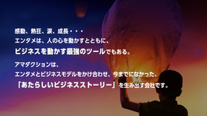 今までのエンタメや芸能を 単純にデジタル化、アップデートするのではなく、 その力を活かして、今までにない、 誰も手を付けなかったあらたな事業を生み出していく。 エンタメ×飲食、×広告、×大学生、×人材・・・ エンタメとビジネスモデルをマッチングさせることで 次々と事業を生み、育て、つなげ、広げていく。 そこで育つ、事業、人、ストーリーが、 また次の、事業、人、ストーリーへとつながっていく。 そうして、 アマダクションにしかできない事業を複数手掛ける 唯一無二の企業へと成長することを目指します。