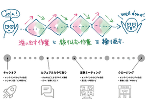 プロジェクトチームの一員としてジョインし、内外の垣根がない状態でチームの内側から価値や熱量を膨らませるスタイルが多いです。実際のプロジェクトではモデリングや検討を繰り返すことが多いため、リニアな進み方ではなくサイクルのように回していく状況が多くなります。
