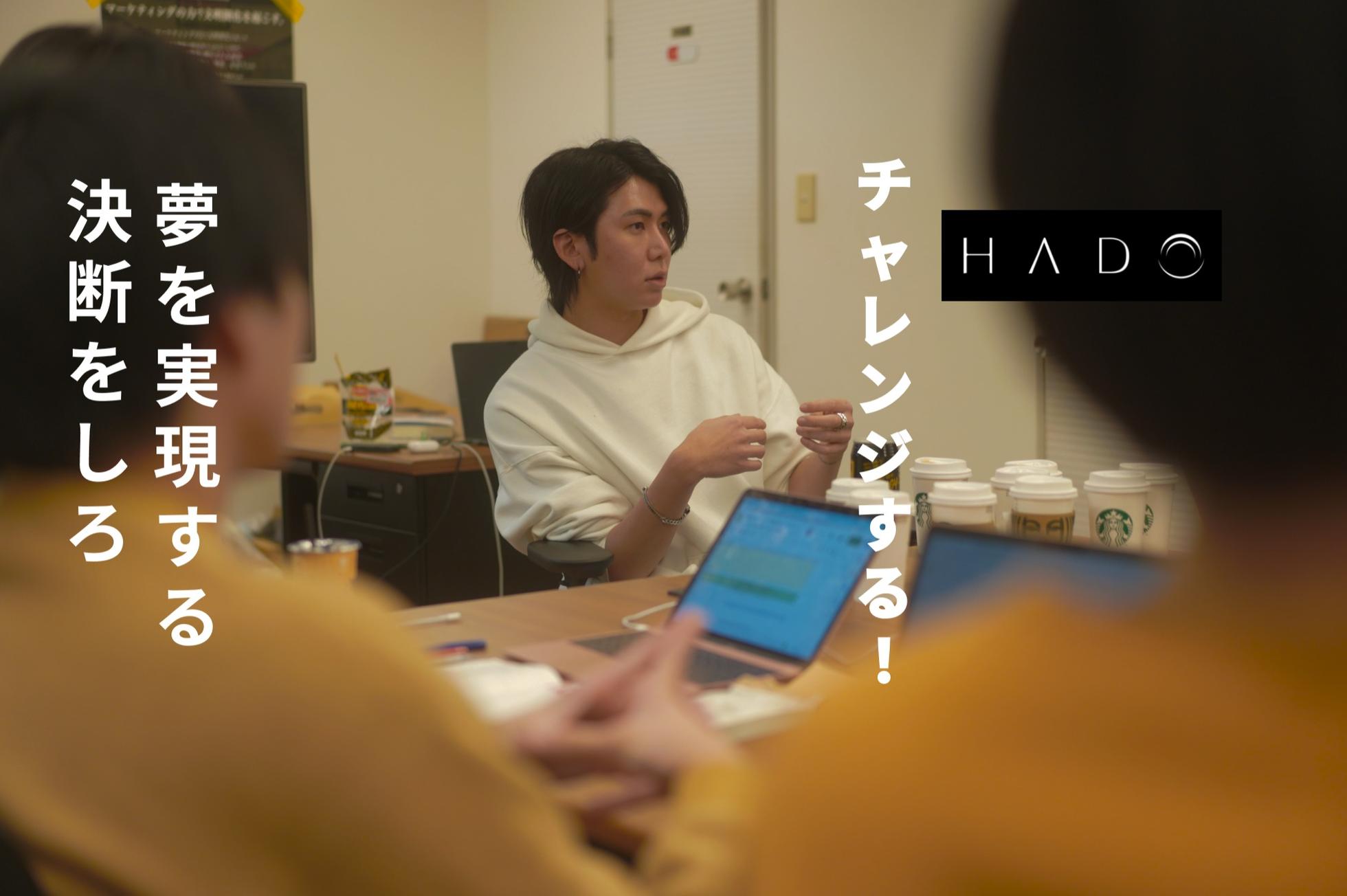 【創業背景】 創業者の田中が前職でサラリーマンとして働いている時、通勤電車でため息をつく大人が苦手でした。飲み会で仕事の愚痴を言う同僚が苦手でした。 どうせ働くなら、後ろ向きな気持ちで働きたくない。 今日のレベルアップを楽しんで、明日からの挑戦にワクワクして働きたい。 自分だけでなく、自分の周りの人たちがそんな前向きな気持ちで働ける場所を作りたい。 そんな想いからHADOを創業しました。 【自らと若者の人生のブレークスルーポイントに。】 新卒至上主義が根強く残る日本では、一度レールから外れてしまった方に対する風当たりは強いです。 創業者である田中も大学を中退していますが、学歴がないことで苦い思いをした経験がたくさんあります。 何らかの理由で会社を辞めてしまった、もしくは就職できなかった方は、確かに一度レールから外れてしまった“経歴に傷がある方”なのかもしれません。 しかし、だからこそ彼らには「次こそは失敗できない」「もう後がない」という焦りと強い覚悟があります。 私たちHADOは、私たちへの相談が彼らの人生のブレークスルーポイントになるように、一人一人の人生に本気で向き合って、日々業務に励んでいます。 【若手の才能開花に投資します。】 HADOは、若い才能が世界を前に進めると確信しています。 世界を前に進めるのに、年齢は関係ない。 むしろ若いエネルギーを才能開花にフルベットすることこそが重要だと。 「若いうちはまず大企業で経験を積んでから〜」なんて言っているとあれよあれよといううちにエネルギーは落ちたり家族ができたりと挑戦のハードルが上がっていきます。 だからこそ、今。 人生で一番気力のある今、挑戦をしよう。