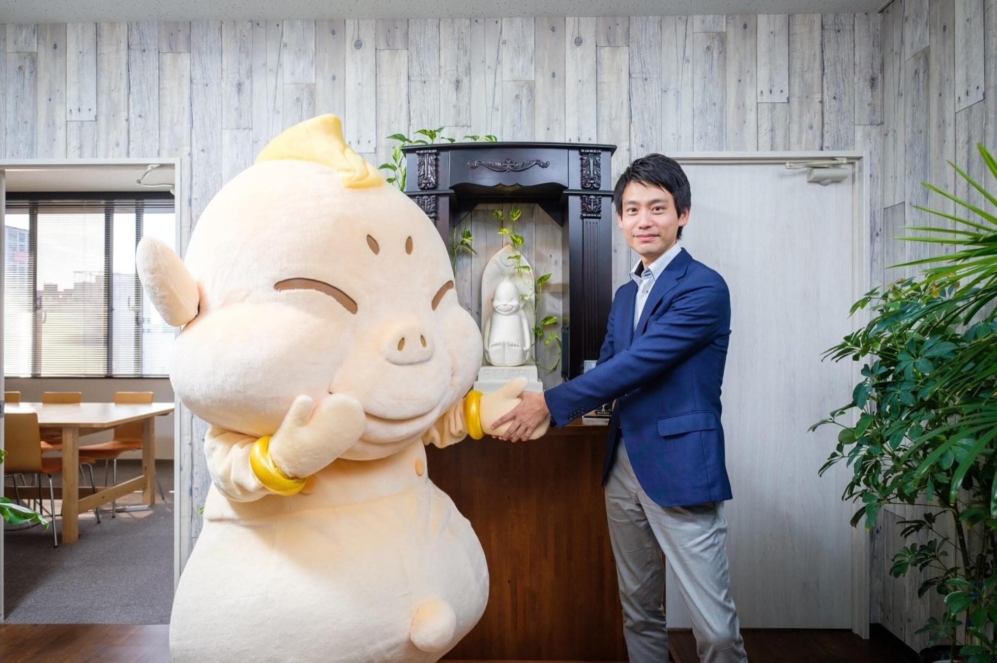 本社のエントランスには、手彫りのビリケン像が鎮座。皆さんにとって今日もご利益がありますように!