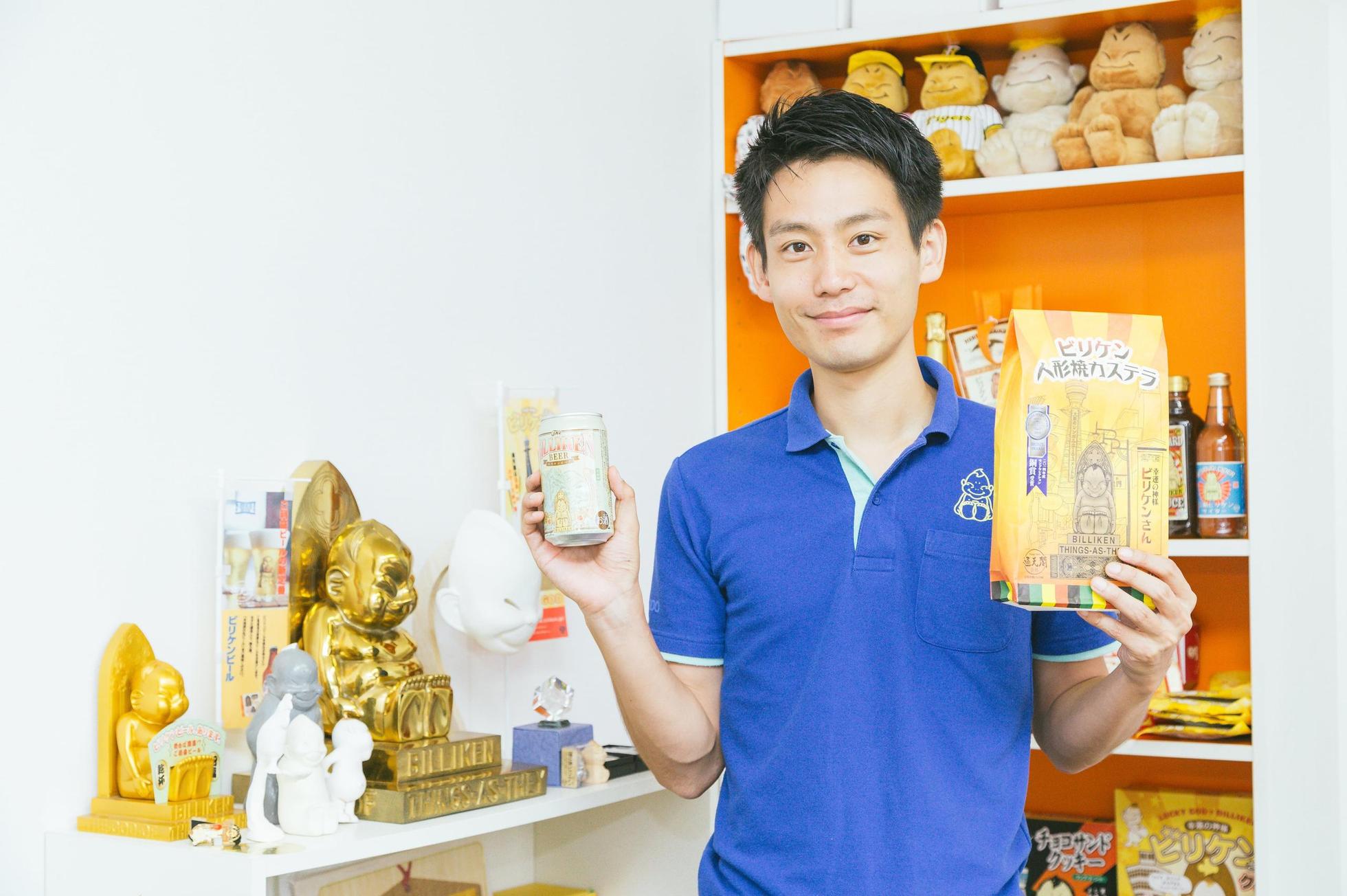 本社のエントランスには、手彫りのビリケン像が鎮座。皆さんにとって今日もご利益がありますように!
