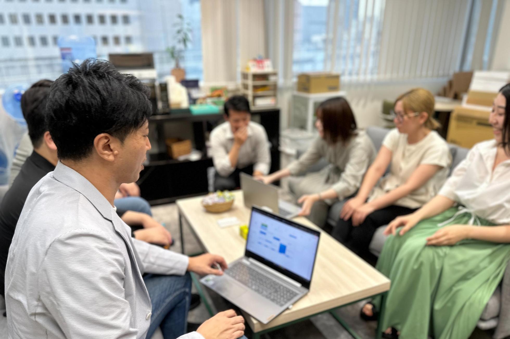 週に1回出社日を設けている事業部も。本日は営業本部が出社日でした。みんなでワイワイ推しの話に花が咲きます。