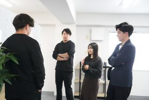 オフィスでのミーティング風景。ホワイトボードに書き出した課題に対し、メンバー全員で意見を出し合いながら進捗を確認している様子です。
