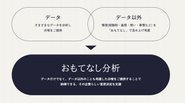 「おもてなし」とは言葉にできないニーズを察し、 先回って対応して差し上げる日本が世界に誇るソフトスキル 分析屋がデータサイエンティストの「おもてなし力」向上のために取り組んでいること 1. MVVに基づいた教育・評価   バリュー・クレドを軸としたマネジメント、日々の行動の積み重ねによって身につけていく。   またおもてなしを体現する先輩社員たちからの学び。 2. ボトムアップ組織   ボトムアップによる「自ら考え動くことが基本」の組織構造によって、   各自が上の指示を待たず臨機応変に各自が思う「おもてなし」を発揮できる環境作り。 3.研修   ハードスキルだけでなく、ソフトスキル・メタスキルの育成も図る研修。   また「おもてなし力」向上に直結するさまざまな機会の提供。 4.データスチュワードとしての経験   データとビジネスの橋渡し役である「データスチュワード」として立ち回る機会の提供を通じ、   「おもてなし」を体感で学ぶ。 5. 健康経営の推進   他者に「おもてなし」を提供するには自分自身の余裕が必要であるため、   社員全員が心地よく過ごせる企業風土づくりにも注力。 研修だけでなくMVVの設定や組織構造全体などを通じ、 「在籍しているだけでおもてなし力が磨かれていく環境」を目指しています。