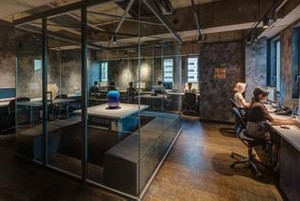 茶室としても使えるガラス張りの会議室を備えるカナタのオフィス