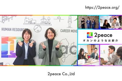 ■オカンのようにお節介で温かく■ 仕事は相手があって初めて成り立つもの。 自分に目を向けるのではなく、他人を思いやれる人間であり続けます。 ▍人財の力で企業の発展に役立ち、豊かで明るい社会づくりに貢献する。 私たちは「人間力」にフォーカスして、人財の皆さんにしっかりと指導、教育を行っています。 人財には2peaceで働くメンバーだけでなく、これから仲間になる方、2peaceから羽ばたいていく方すべてを含みます。スキル・技術の大切さも理解しつつ、何よりも人間性のある人財を輩出してまいります。 ■起業から今につながるストーリー■ 当社代表が社会人人生を歩み始めた当時、自分のために勉強していた学生時代とは大きく変わり、社会では相手の満足度がそのまま自分に跳ね返ってくる感覚を知ることになります。セールスでも自分が売りたいものを売るのではなく、まずは自分を知ってもらい、自分のファンになってもらうことの大切さに気付きました。しばらくして体調を崩し、働くことの大変さ、尊さ、難しさを実感します。 世の中には自分と同じような思いを抱く人がいるはず。 そうした人たちの力になりたい。 自分だからできることがある。 そうは言っても企業に人材を紹介するだけでは、私がやる意味がないだろう。 ならば――。と社会貢献できる事業を結び付けて現在の2peaceを立ち上げます。 ■解決したい問題■ いじめ・不登校など学校にまつわる問題について行政や企業のアプローチが行われていますが、認知件数・生徒数はそれぞれ増加しています。これらの問題には学生時代の過ごし方が深く関わっていると私たちは考えました。実際の活動として当社事業の一環で学校を回って研修を実施し、不登校の状態にいた生徒が通学・登校できるようになったケースもあります。 この取り組みを就職活動につなげれば、学生本人が社会に出て誰かの役に立てるようになります。地方で行えば地域に活力が生まれ、いずれ過疎化が解消されていくはずです。 2peaceは組織体制を整えつつ事業会社を立ち上げ、雇用を賄える環境をつくり、ゆくゆくは地方での人材育成を開始。リモートでも働ける環境をつくっていく所存です。