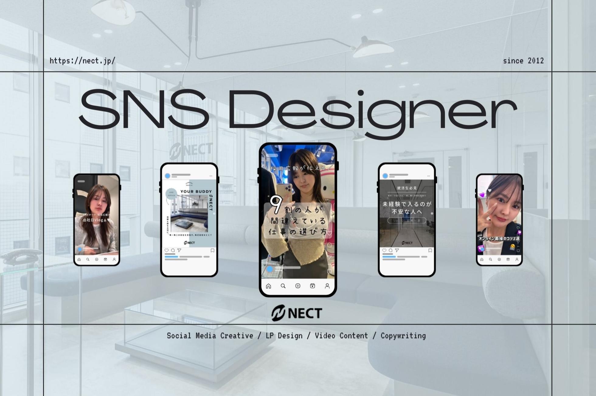 SNS広告の企画・デザイン、動画の撮影・編集など、当社の魅力を発信するコンテンツ制作をお任せします。 \\NECTで働くポイント!// ★大きな裁量でデザイン・企画に携われる! ★Instagram/TikTok/YoutubeなどのSNSを舞台に活躍! ★未経験からチャレンジOK!100%ポテンシャル採用! ★ワークライフバランスを大切にしながら働ける! ≪≪新たなメンバー積極採用中≫≫ さらなるサービスの拡大、組織強化に向けて、広報・マーケティングチームを新規で立ち上げました。 あなたにお任せするのは、クリエイティブを通じて当社の魅力を発信すること! 「デザインに興味がある」「つくることが好き」という方は、ぜひ一緒に成長していきましょう。 【★具体的な業務内容】 Instagram/TikTokなどのSNSやSNS広告のデザイン制作、Youtubeをはじめとした動画の撮影・編集、自社サービスの販促・PRなどの企画を行います。 <業務内容例> ◎SNSコンテンツやSNS広告のデザイン制作 ◎YouTube、TikTokなどの動画撮影・編集 ◎求人メディアのデザイン制作 ◎社内広報のコンテンツ制作 ◎コピーライティング ◎セミナー、インターン資料、入社資料などのパンフレット作成 ※上記の業務をいきなり全て任せることはありません! できることから始めて、少しずつ仕事の幅を広げていきましょう。 デザイン制作はCanvaなど身近なツールも使用するので、未経験の方も安心です。 【★研修からスタート!】 入社後、まずは当社の事業内容や業務フローを理解するために研修からスタートします。 デザインスキルやSNS運用の知識などは基本から習得できるので、「やってみたい!」という意欲を形にできる環境です。