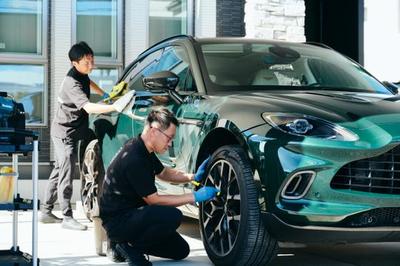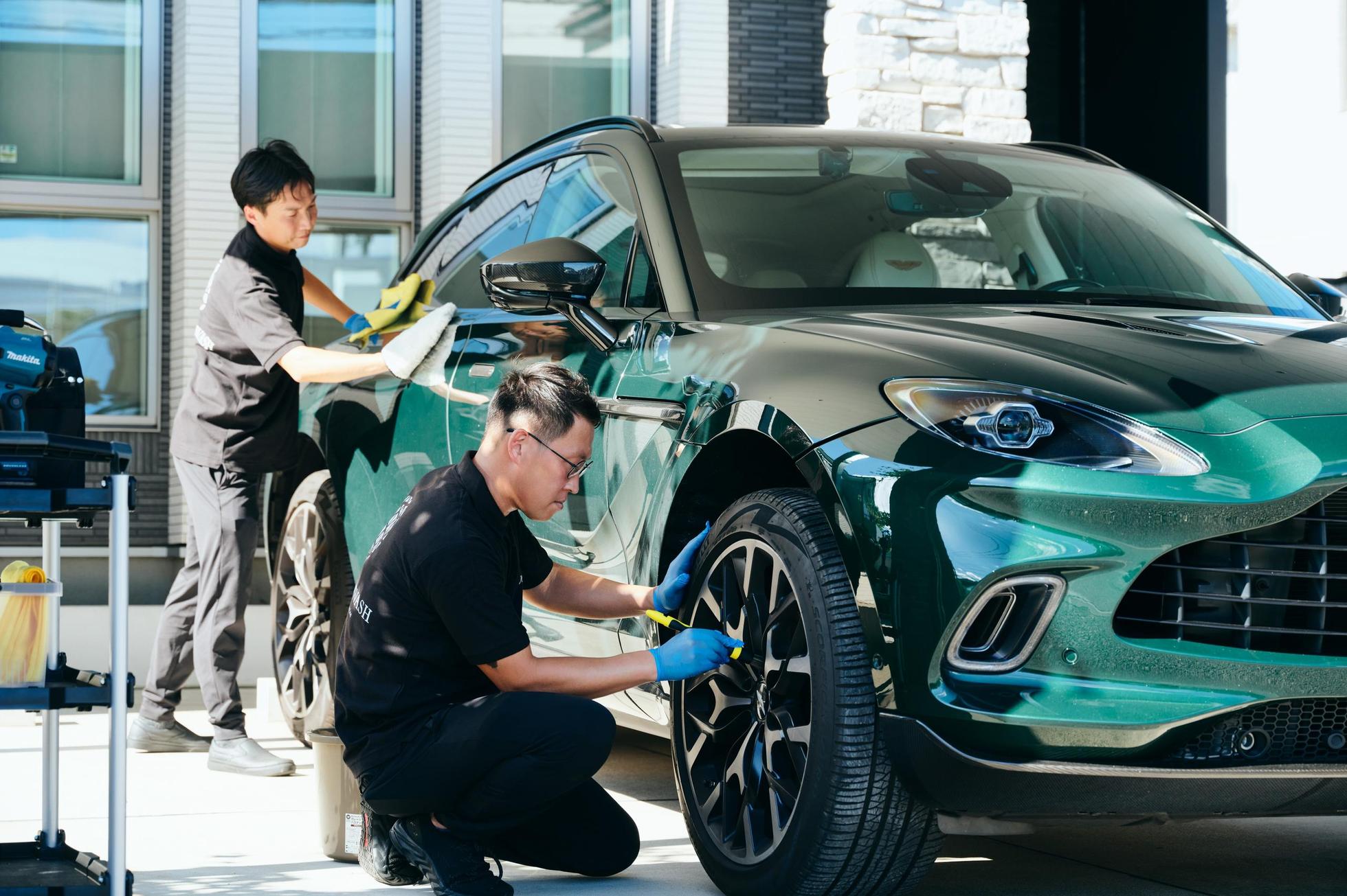 施設の駐車場にて、車を動かさずその場で洗車をします