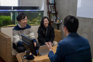 社内の打ち合わせ風景。後ろの水槽の魚はすべて捕まえてきたもの