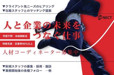 派遣や紹介事業において人材を必要としている企業のお客様と求職者を結ぶコーディネート業務を行います。 \ポイント/ ★95%が未経験スタート 介護職・事務職・飲食店の接客職・アパレル販売職など、ほとんどの社員が未経験から転職。 未経験者の気持ちに寄り添って指導していきます! ★不安な気持ちとは無縁 わからないことはヒントを出したり一緒に考えたりと面倒見が良い社員ばかり。 あなたが理解できるまで丁寧に指導するので安心してくださいね! 【企業対応】 ■クライアントのニーズのヒアリング ■スタッフのマッチング提案 …他 ┗「どんな人材が必要か」「働き方の条件」などヒアリングしながら、企業にマッチする人材を導きます。 【求職者対応】 ■新規スタッフの募集・採用・面談 ■業務開始後の各種フォロー …他 ┗「やってみたい仕事は?」「「仕事の悩みは?」など、求職者に寄り添いながらサポートします! ★得られるスキル★ 多彩な業界やバックグランドが異なる求職者と関わることで、知見を広げることができます。 また「○○さんでよかった」など、嬉しい言葉をいただくことも。 未経験から頼られる人材へと成長できるポジションです! 【研修制度】 ▼社内研修(商品知識、コンプライアンスなど) ▼パートナー企業先での研修 ▼OJT研修(先輩に同行し、クライアント先で業務を体験) ▼人材コンサルタントとして活躍! ┗「名刺の渡し方」「ビジネスマナー」など、イチから習得可能です! ※経験者の方は「サブ担当から」など、スキルに合った業務からお任せ!徐々にメイン担当を担います。 【知識を磨いていける】 「成功事例」や「困りごと」などを共有できるミーティングを開催! 情報交換で悩みを解決に導くだけでなく、同じような事例があれば活用できるので効率的に行動できます! 【多彩な経験で市場価値アップ】 ジョブチェンジ制度を取り入れている当社では、あなたのやりたいことを全力でサポート! 人事・広報・経営企画などへのチャレンジできる機会も!