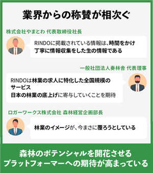 日本初の林業特化の専門求人サイトを運営する株式会社RINDOです。 企業向けサービスとして、様々な林業事業体へ「RINDO」という弊社の林業特化の専門求人サイトを通して採用支援と、森林への移住・転職支援やフォレストワーカーの採用支援など、求職者の会員サービスも行っております。 なお、各官庁や行政団体との定期的な連携もあり、講演や採用運用コンサルティングの機会創出もしております。 🔲事業設立当初からの想い 「想いのある林業の人々に出会い、人材不足の事実を知り想いに寄り添う。」 私たちRINDOは、求職者からの “専門人材用サービス” への期待値を体現します。 通常の求人・転職サービスの場合、専門職求人はその他多くの業種の求人で埋もれてしまうことが多く、事業者と求職者のマッチングが困難になります。そうした状況の中、IT人材専用や介護職専用など、大手求人サービスを中心に様々な専門職を対象とした人材用サービスが増えています。働き方が多様化し、転職も盛んに行われるようになった昨今、自分に合った仕事を効率的に探すことができる専門性の高い人材用サービスはますます需要が高まっています。
