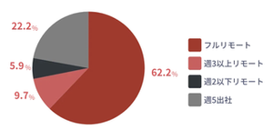 フルリモート:62.2% 完全在宅(もしくはフルリモート)で働いている人が全体の約6割を占めています。 週3日以上リモート:9.7% 週に3日以上はリモートワーク、それ以外は出社というハイブリッド型が約1割。 週2日以下リモート:5.9% リモートは週2日までで、出社が中心の働き方が約6%。 週5日出社:22.2% 毎日出社している人は全体の約2割強となっています。