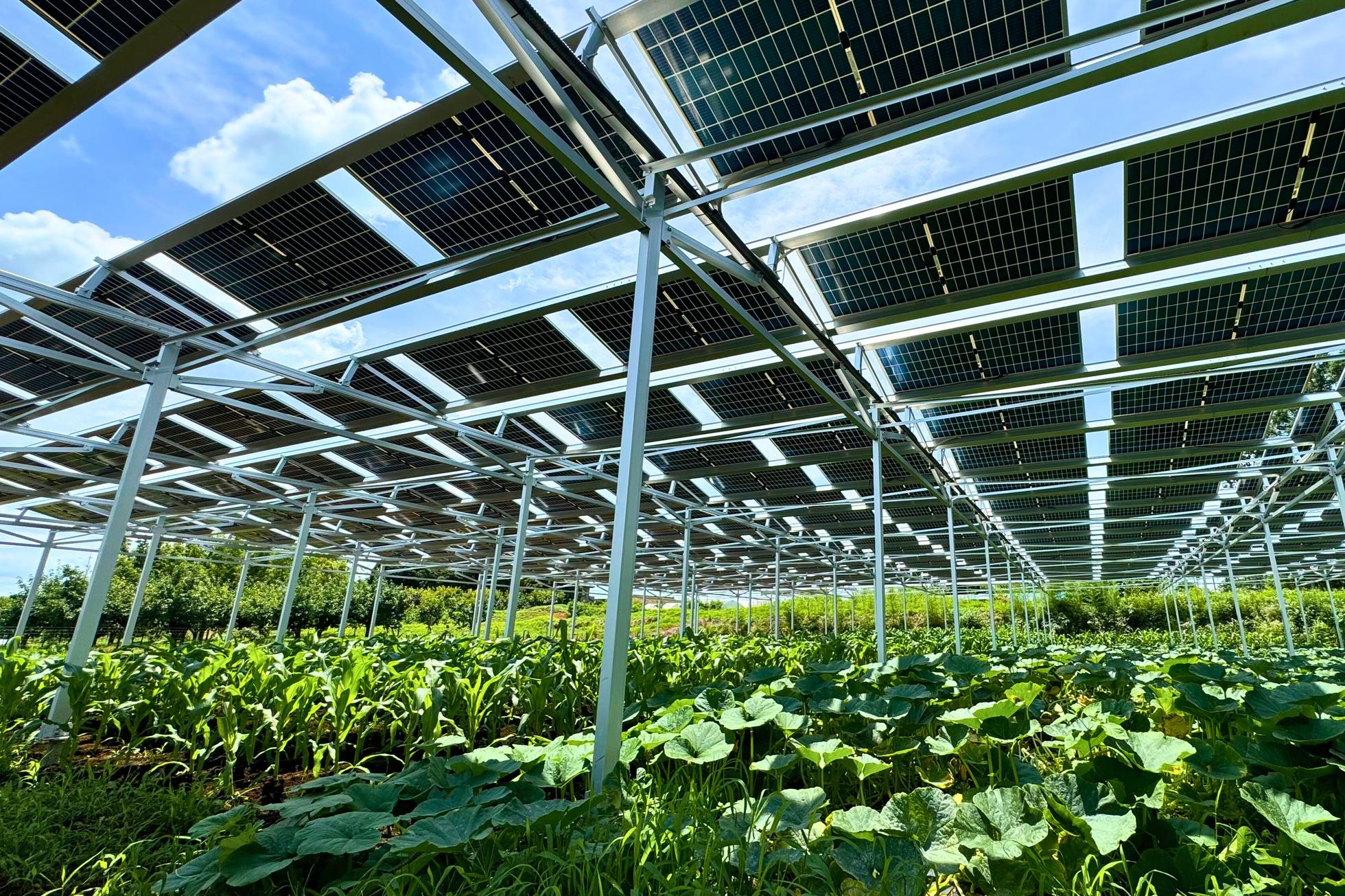 実際の営農型太陽光発電所の様子。気候変動に悩まされる農業。しかしパネルの下だからこそ、立派に作物が育ちます。
