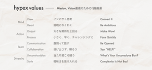 Missionである”組織を多様に、チームをしなやかに”を実現するために会社運営をしています。 ①社会とお客様に対する目的 労働人口の低下により、働く人より企業が多くおり、企業が選ばれる時代(売り手市場)になっています。 従来の採用手法は募集さえ出せば採用できる時代(買い手市場)に特化されていました。 そのため、今までの手法を利用するとブランド力のある会社のみ採用がうまくいき、ブランド力の小さいBtoB企業などは採用が出来づらくなっています。 また、リモートワークが標準化されたことにより、採用対象者が広がった企業が増えた反面、リモートワークの難しい業種などでは競合企業がより増加し、採用が難しくなっています。 採用課題は組織課題へ繋がり、売り上げや利益を左右する事業課題になります。 採用や会社のPRやマーケティングが得意ではないが、素晴らしい経営方針によりお客様と従業員に喜ばれている企業が沢山あります。 総合的な採用マーケティングは、そのような企業の経営戦略の大きな柱です。 実際にスタートアップやベンチャー企業では当たり前の取り組みが、世の中の99%の会社では全く行われていません。例えば、採用ピッチ資料やSNS、社内の写真のクオリティへこだわることなどです。 hypexのメンバーはスタートアップやベンチャー出身のメンバーが多いです。 次のスタンダードを標準化と個別化し、社会へ貢献する大企業や地方企業へ取り入れていくことが、hypexの目的です。 ②hypexで働く人に対する目的 hypexは、従業員が「仕事が楽しくなる会社」、従業員の家族が「応援できる会社」を目指しています。 そのためには、健全な運営と挑戦が必要です。 健全な運営では、事業の継続的な成長や福利厚生、よりロングランができるような制度の導入です。 挑戦では、リモートワークや振替などの働き方へのチャレンジや、明確な戦略(トップダウン)とオペレーションの改善(ボトムアップ)の両立などが当てはまります。 同業界で収益性の高い事業を目指し、働く従業員へ還元することを目指します。