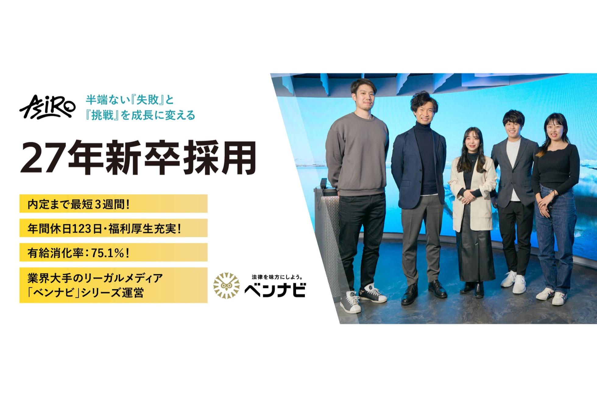 私たち「株式会社アシロ」は、Legal×Techonology|法律・弁護士業界とインターネットを結びつけた事業を展開し成長を続けるベンチャー企業です。 2021年7月にマザーズ(現:グロース)市場へ新規上場し、今後更なる事業成長を加速させていきます。 社会的基盤である法律・弁護士業界とインターネットを結びつけた事業を展開しています。 デジタル技術やウェブマーケティングノウハウを活用して、インターネット上で法律情報や弁護士情報を提供するリーガルメディアサイトの運営を主要事業としています。 社名の由来である『アシロ』は 「世界中の誰よりも深くユーザーとお客様を幸せにしたい」 「社会基盤となりうる水準までサービスを深化させたい」 という思いから、世界最深地点で生存が確認された深海魚の名前(ヨミノアシロ)を拝借したのが社名の由来です。 創業時から一貫してその思いが変わることはありません。 ■リーガルメディア事業 「法律の民主化を図り、法律トラブルで悩むユーザーをゼロにする」 法律問題を抱える方が、ニーズに適した専門家と出会うため法律系ポータルサイトを運営しています。「労働問題」「離婚問題」「相続問題」「交通事故」「刑事事件」などに注力する法律事務所・弁護士にフォーカス。分野特化型法律メディアとしては、最大級のメディアとなりました。 『弁護士さえいれば解決できた』『こんな大事にはならなかった』という法律的な問題はいくつもあり、その問題をできるだけ早く、ユーザーが納得のいく解決として頂くために、私たちは『弁護士とユーザーを繋ぐ』架け橋になるサービスを運営しています。 法律をより身近な存在にし、弁護士に頼りやすい・弁護士が力を発揮しやすい環境を整えることで、ユーザーが抱える心配ごとが限りなくゼロになる社会を目指します。 *サービス一覧 https://asiro.co.jp/business/lawyer-media/ ■派生メディア事業 「ITの力で不安や不満を解消して、ユーザーを幸せにする」 大手探偵事務所と提携した「浮気調査ナビ」や、転職したい人に最適なエージェントを紹介する「キャリズム」など、法律問題から派生したメディアを複数運営しています。 法律トラブルの発生に伴う、その他の悩み・トラブルを解決に導くことで、生き辛さを抱えている人を助けることを目指しています。 *サービス一覧 https://asiro.co.jp/business/lawyer-media/ ■HR事業 「クライアントと求職者、双方にとって最善の出会いを提供する」 培ってきた顧客網や業界知識を活用し、弁護士有資格者をはじめとしたプロフェッショナル人材の紹介事業を行っております。転職者の不安を取り除くとともに、採⽤の架け橋となることを通じて、⼈材採⽤の架け橋となることを通して個⼈・企業・法律事務所の成⻑、そしてより良い社会の実現に貢献します。 *サービス一覧 https://asiro.co.jp/business/legal-hr/ ■保険事業 日常生活で遭遇したトラブルの解決を弁護士に依頼したときに生じる費用を補償対象とする「ベンナビ弁護士保険」を取り扱っております。弁護士費用がネックとなって法的弱者が救済されない等といった社会課題の解決の一助となるべく、本保険商品の普及を進めております。 *サービス一覧 https://asiro.co.jp/business/insurance/ ----------------- ・従事すべき業務の変更の範囲: (雇入れ直後)入社直後の変更なし (変更の範囲)ご本人の業務適正により、当社業務全般に変更の可能性あり ----------------- ・就業場所の変更の範囲 (雇入れ直後)本社及び労働者の自宅、その他自宅に準じる場所(会社指定の場所) (変更の範囲)会社の定める場所(テレワークを行う場所を含む)