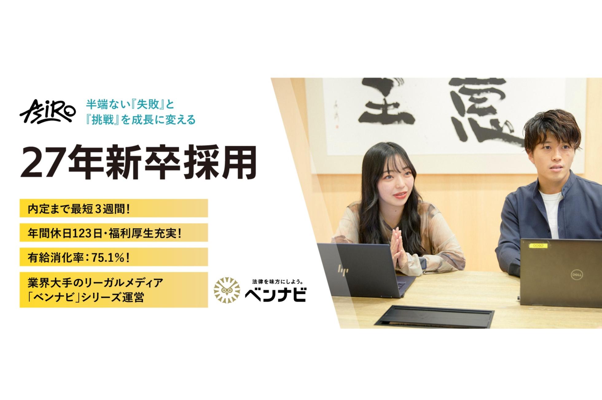 私たち「株式会社アシロ」は、Legal×Techonology|法律・弁護士業界とインターネットを結びつけた事業を展開し成長を続けるベンチャー企業です。 2021年7月にマザーズ(現:グロース)市場へ新規上場し、今後更なる事業成長を加速させていきます。 社会的基盤である法律・弁護士業界とインターネットを結びつけた事業を展開しています。 デジタル技術やウェブマーケティングノウハウを活用して、インターネット上で法律情報や弁護士情報を提供するリーガルメディアサイトの運営を主要事業としています。 社名の由来である『アシロ』は 「世界中の誰よりも深くユーザーとお客様を幸せにしたい」 「社会基盤となりうる水準までサービスを深化させたい」 という思いから、世界最深地点で生存が確認された深海魚の名前(ヨミノアシロ)を拝借したのが社名の由来です。 創業時から一貫してその思いが変わることはありません。 ■リーガルメディア事業 「法律の民主化を図り、法律トラブルで悩むユーザーをゼロにする」 法律問題を抱える方が、ニーズに適した専門家と出会うため法律系ポータルサイトを運営しています。「労働問題」「離婚問題」「相続問題」「交通事故」「刑事事件」などに注力する法律事務所・弁護士にフォーカス。分野特化型法律メディアとしては、最大級のメディアとなりました。 『弁護士さえいれば解決できた』『こんな大事にはならなかった』という法律的な問題はいくつもあり、その問題をできるだけ早く、ユーザーが納得のいく解決として頂くために、私たちは『弁護士とユーザーを繋ぐ』架け橋になるサービスを運営しています。 法律をより身近な存在にし、弁護士に頼りやすい・弁護士が力を発揮しやすい環境を整えることで、ユーザーが抱える心配ごとが限りなくゼロになる社会を目指します。 *サービス一覧 https://asiro.co.jp/business/lawyer-media/ ■派生メディア事業 「ITの力で不安や不満を解消して、ユーザーを幸せにする」 大手探偵事務所と提携した「浮気調査ナビ」や、転職したい人に最適なエージェントを紹介する「キャリズム」など、法律問題から派生したメディアを複数運営しています。 法律トラブルの発生に伴う、その他の悩み・トラブルを解決に導くことで、生き辛さを抱えている人を助けることを目指しています。 *サービス一覧 https://asiro.co.jp/business/lawyer-media/ ■HR事業 「クライアントと求職者、双方にとって最善の出会いを提供する」 培ってきた顧客網や業界知識を活用し、弁護士有資格者をはじめとしたプロフェッショナル人材の紹介事業を行っております。転職者の不安を取り除くとともに、採⽤の架け橋となることを通じて、⼈材採⽤の架け橋となることを通して個⼈・企業・法律事務所の成⻑、そしてより良い社会の実現に貢献します。 *サービス一覧 https://asiro.co.jp/business/legal-hr/ ■保険事業 日常生活で遭遇したトラブルの解決を弁護士に依頼したときに生じる費用を補償対象とする「ベンナビ弁護士保険」を取り扱っております。弁護士費用がネックとなって法的弱者が救済されない等といった社会課題の解決の一助となるべく、本保険商品の普及を進めております。 *サービス一覧 https://asiro.co.jp/business/insurance/ ----------------- ・従事すべき業務の変更の範囲: (雇入れ直後)入社直後の変更なし (変更の範囲)ご本人の業務適正により、当社業務全般に変更の可能性あり ----------------- ・就業場所の変更の範囲 (雇入れ直後)本社及び労働者の自宅、その他自宅に準じる場所(会社指定の場所) (変更の範囲)会社の定める場所(テレワークを行う場所を含む)
