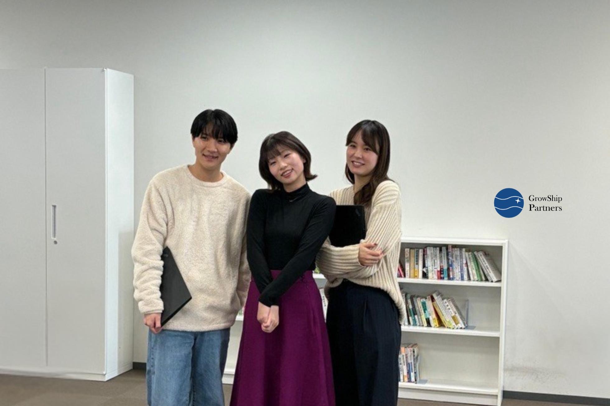 グローシップ・パートナーズの人事・採用チームです! 新卒・中途のリクルートを「関谷」「小笠原」「海下」の3名で行っています。 ◆関谷 社内は、コンサルタント、エンジニア、デザイナーなど様々な専門性を持った社員が協力しあって新しいことに取り組んでいます。 新たなことにチャレンジしたい、チームで新たなことを成し遂げたい、そのような思いに共感できる方に是非応募いただきたいと思います。 皆で成長できる環境で一緒に働きませんか。 ◆小笠原 リクルーターとして、応募者の方の応募から入社までをご支援しています。 また、当社のことをより知っていただくために、WantedlyやSNSで当社の雰囲気・魅力を発信しています。 ストーリーは毎週月曜に更新しています、こちらもぜひご覧ください。 未経験の方大歓迎です!少しでも興味を持っていただけたらお気軽にご応募ください! ◆海下(かいげ) 人事・採用のバックオフィスとして、みんなが働きやすく、何でも気軽に相談できる職場環境にしていきたいと思っています。 当社を少しでも知っていただきたいので、先ずはミートアップに参加して、社員と気軽に話してもらえると嬉しいです。 ご応募お待ちしています♪