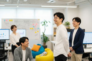 職種を越えて笑顔で議論。心理的安全性と速い検証サイクルで、アイデアを“成果”に変える文化があります。